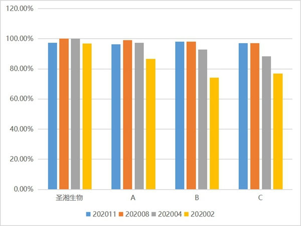 可以看出,金年会jinnianhui生物的新型冠状病毒核酸检测试剂在检测不同浓度阳性样本时,均具备较高的符合率;尤其是对第一次2020002号640copies/mL浓度样本、第二次202009号3.5X103 copies/mL浓度样本的检出率,远超其他主流厂家。
